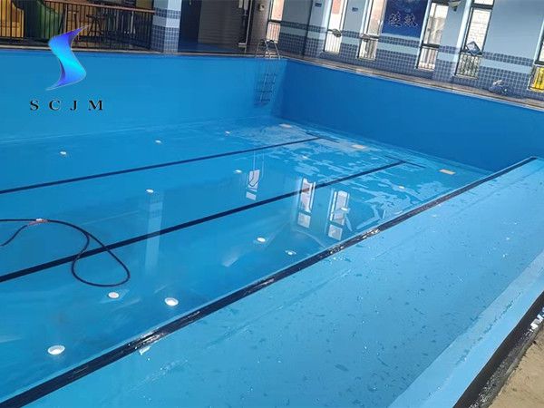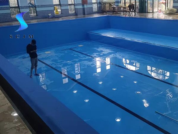 本項目位于四川成都市,為室內游泳池,采用1.5mm藍色游泳池防水膠膜,滿刮膠搭邊熱熔焊接工藝,整體效果如下: