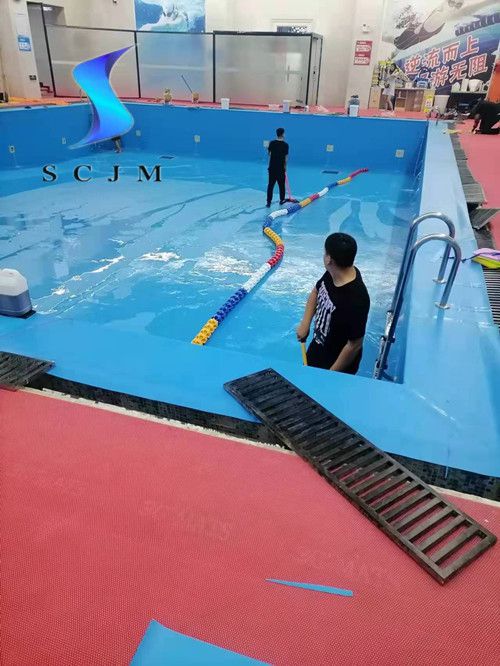 本項(xiàng)目位于河北省唐山市地區(qū),基礎(chǔ)面為混凝土結(jié)構(gòu),基礎(chǔ)面水泥砂漿找平處理,達(dá)到平整、干燥、不起砂后使用滿刮膠搭邊熱熔焊接工藝進(jìn)行游泳池膠膜拼接安裝,整體下過如下: