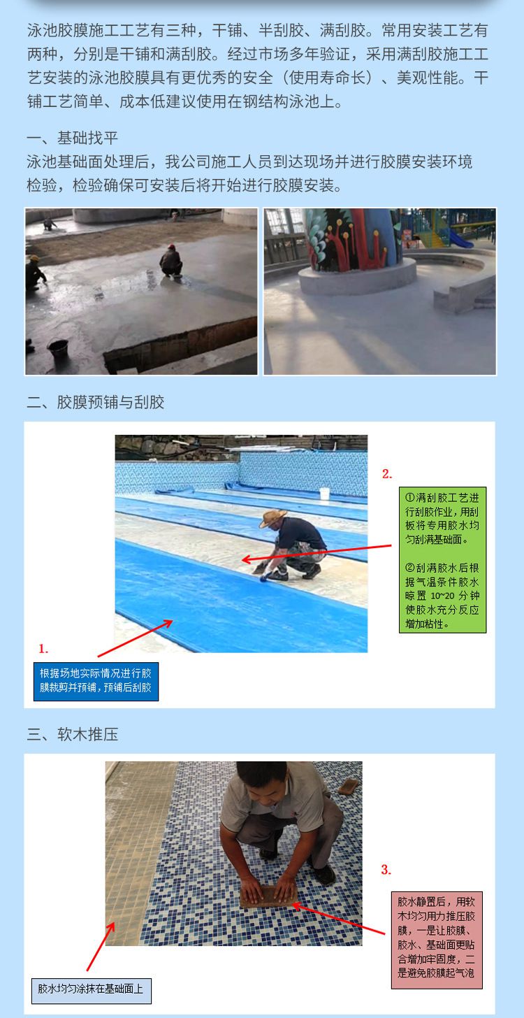 確實是這樣,安裝游泳池膠膜的工藝有多種,這個需要根據個人情況選擇,一分錢一分貨,要想做的效果更佳,那就需要多投入一點費用,總之這幾種工藝都可以,但是就安全牢固來講,推薦使用滿刮膠工藝。
